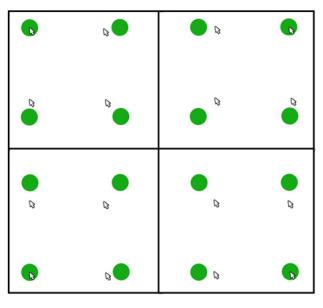 | An example of Satellite Cursor, with one cursor per green target, all moving synchronously. Source: Article. |